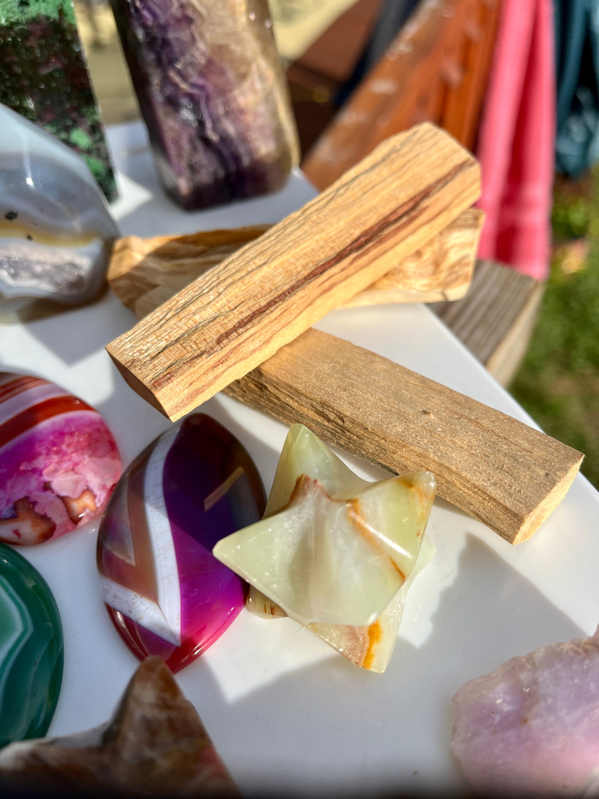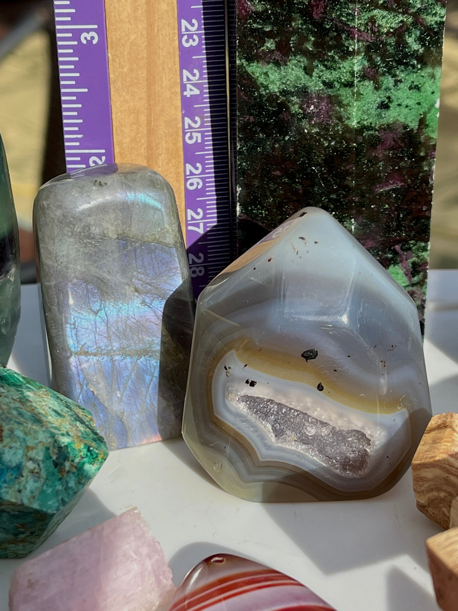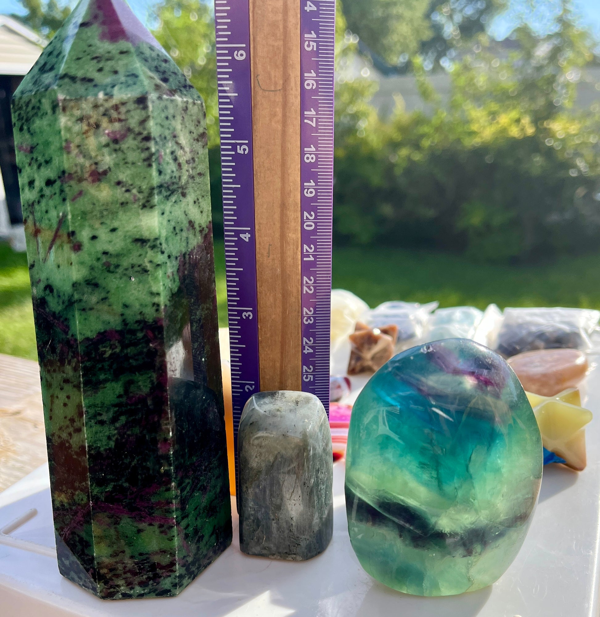 Stunning (1)BIG ruby zoisite TOWER, (1) colorful RAINBOW FLUORITE stand, (1) gorgeous PURPLE LABRADORITE stand, (1)DRUZY agate stand, (1)flashy labradorite RING, (4) colorful agate cabachones, (4) bags of assorted CHIPS, (1)CRYSYCOLA Cube, (3)PALO SANTO sticks, (1) rainbow fluorite Tower, (3) Agate stars, (3)