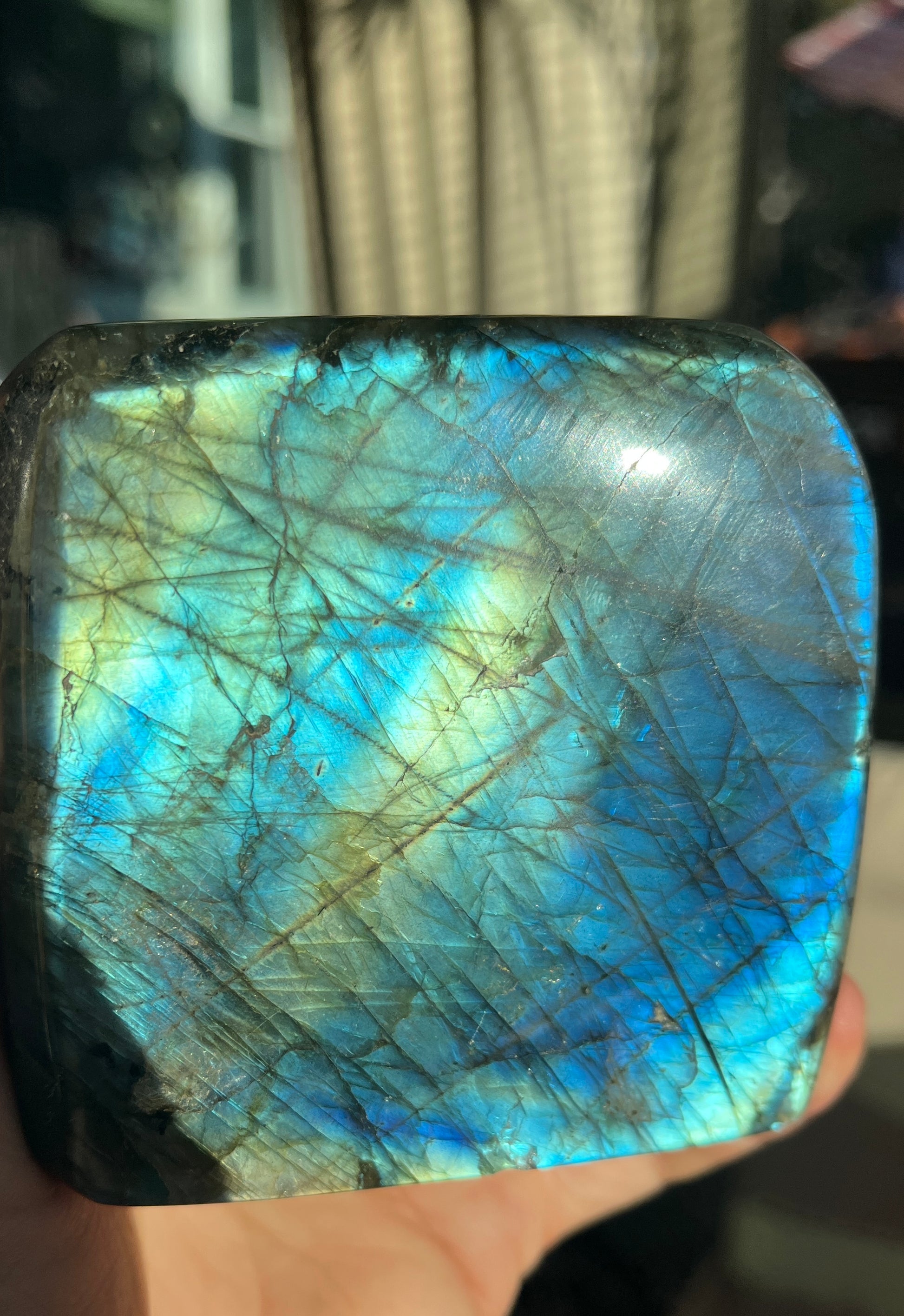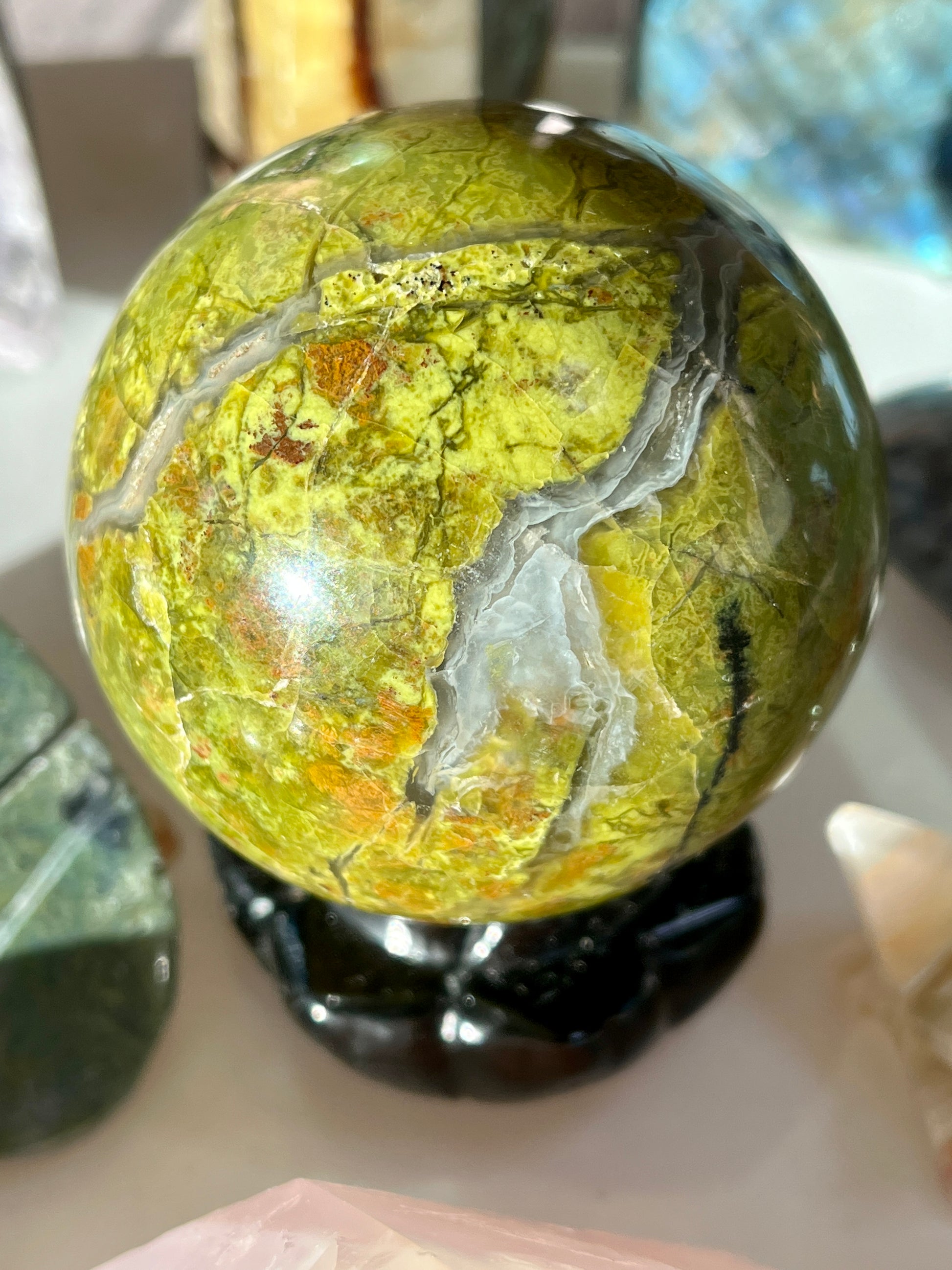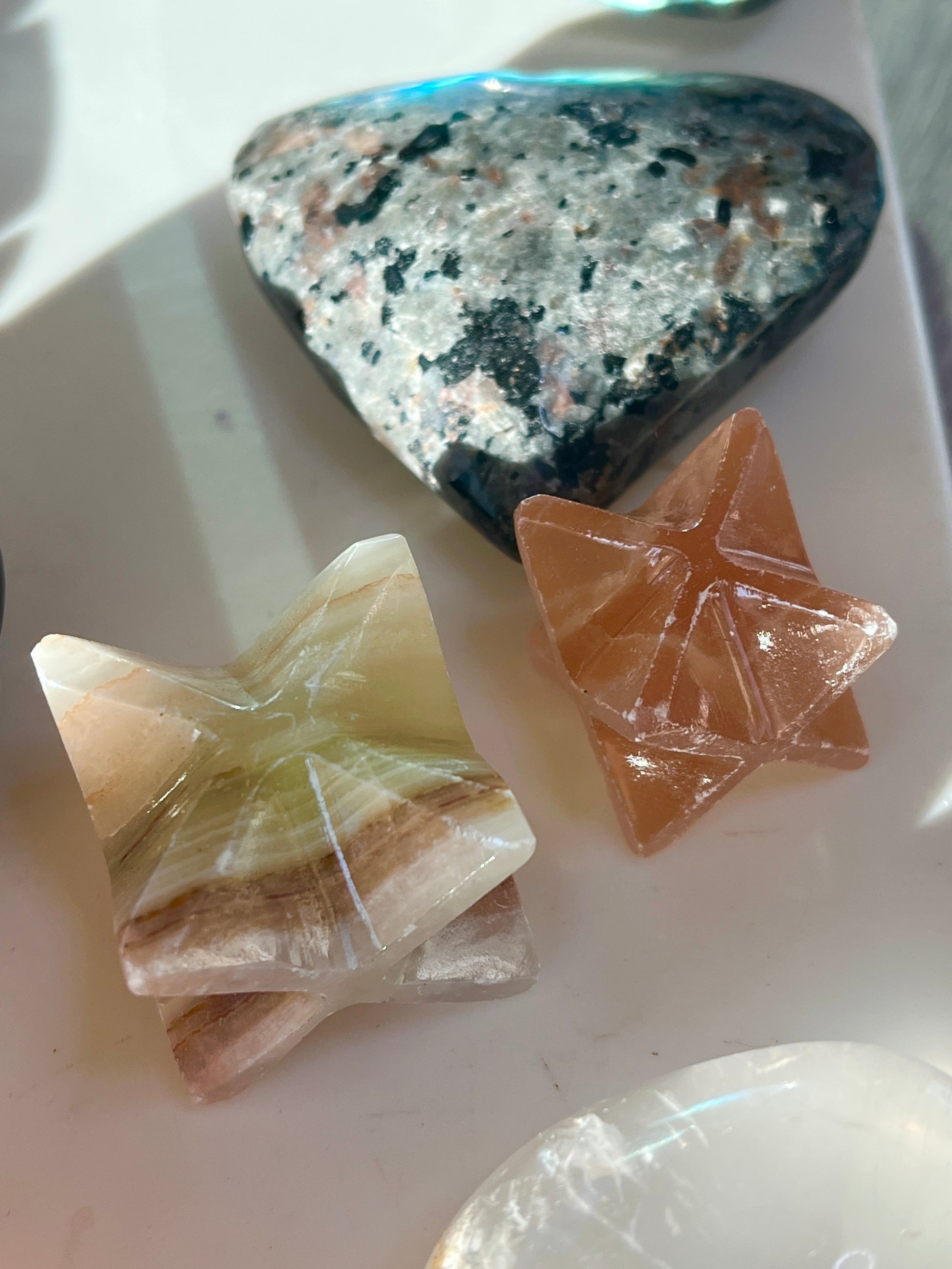Stunning (1) stunning ELECTRIC BLUE labradorite stand, (1) gorgeous green opal sphere, (1) moss agate leave, (1)shinny amethyst stand, (1) PINK AURA raw point, (9)assorted PALMSTONES, (1) glowing heart, (2) starts, (1) tower!!!