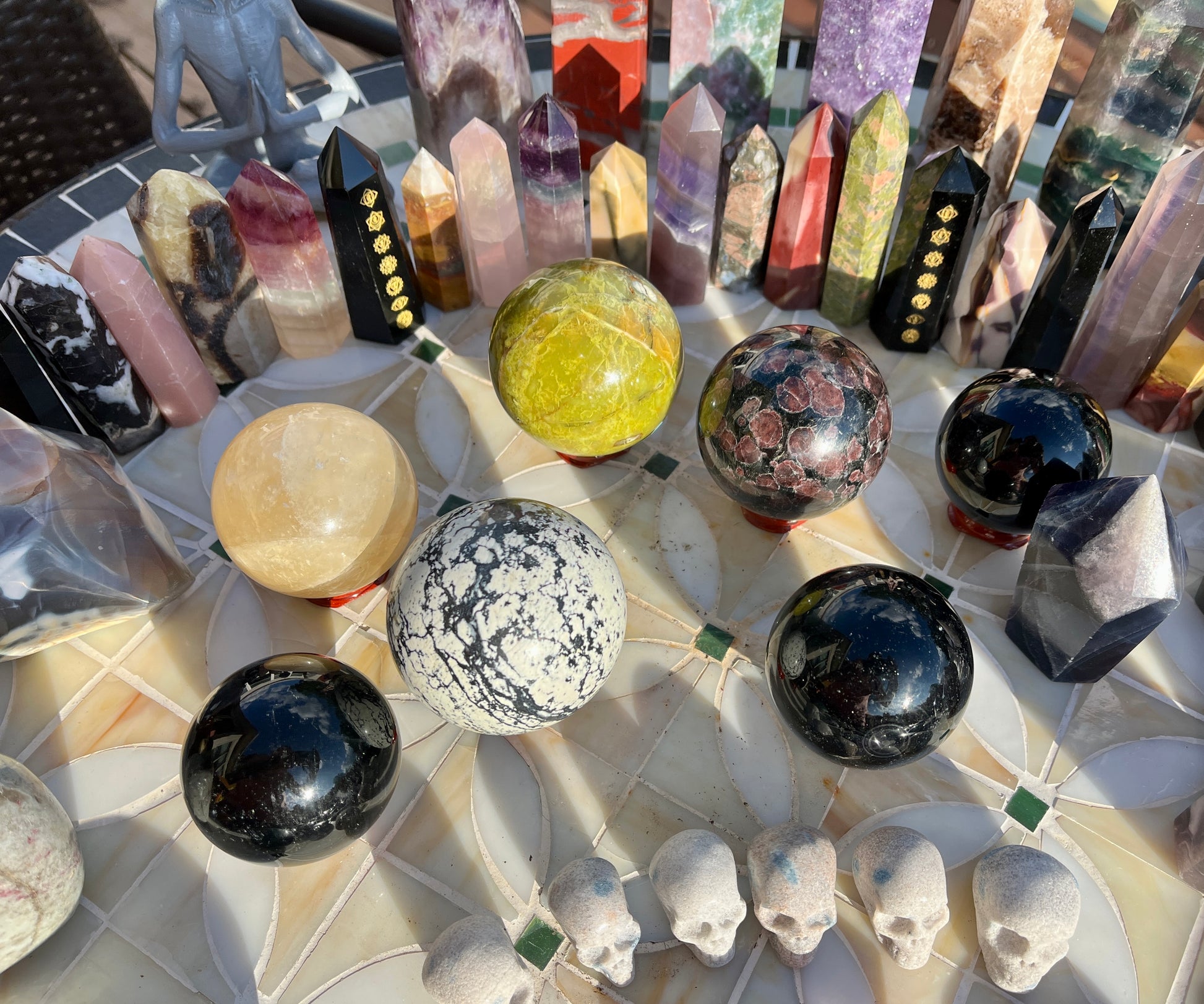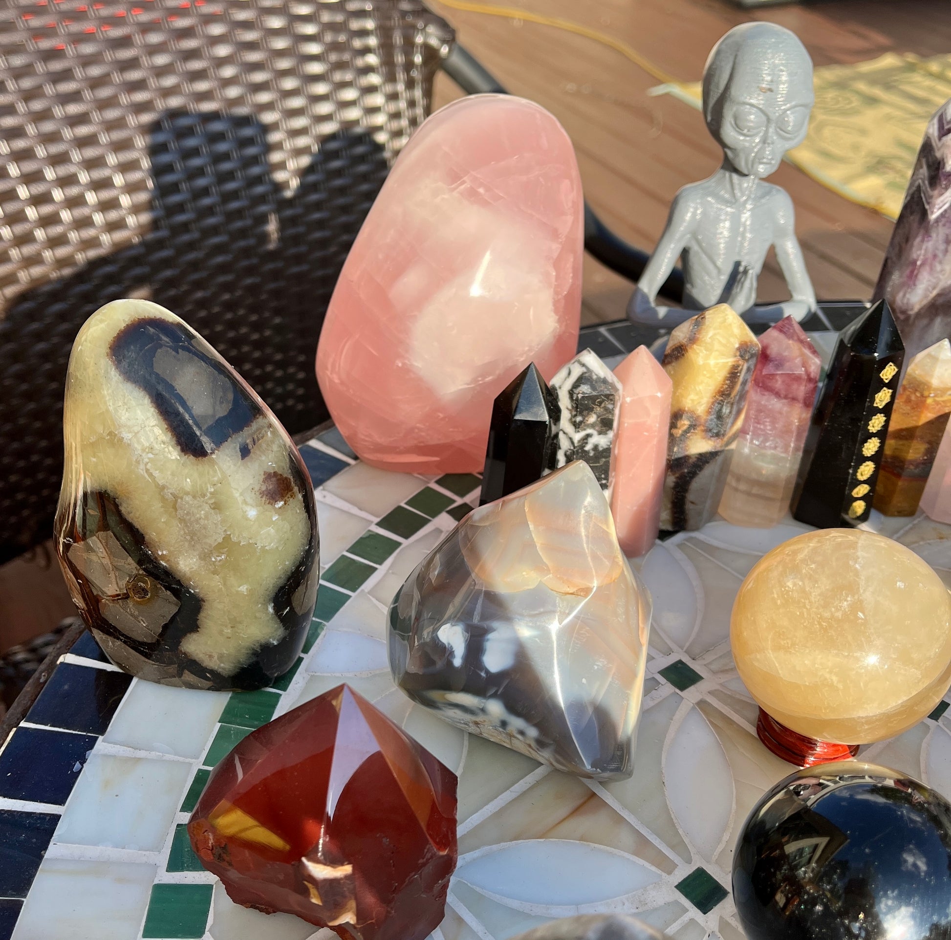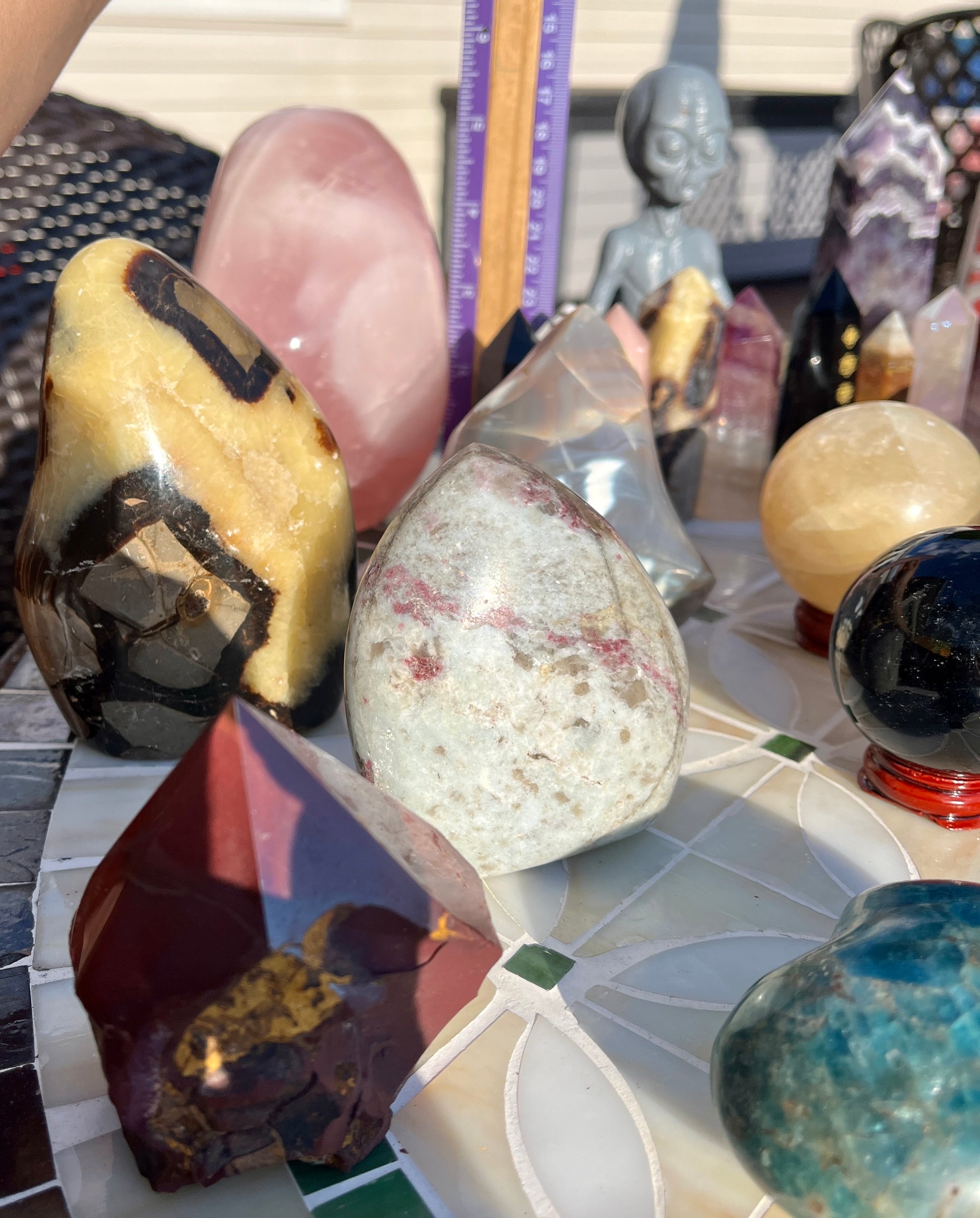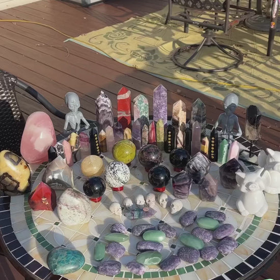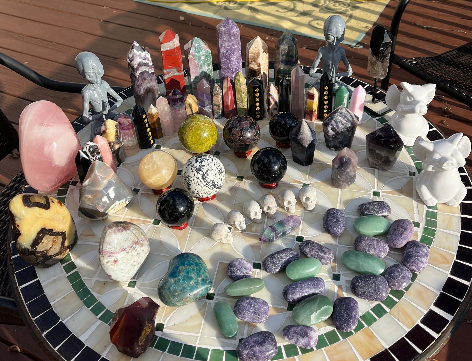Stunning (2)Alien statue, (7)big obelisks (assorted stones) (1) rose quartz freeforms , (1) septarian freeform, (1)pink tourmaline freeform, (1)orca flame, (22)assorted crystal points, (1)mookite raw point, (4)pcs rainbow fluorite points, (2) ceramic elephants, (6) assorted spheres, (1)blue apatite heart, (6)small skulls, (14)lepidolite palmstones, (5)green aventurine, (1)double point rainbow fluorite point!!