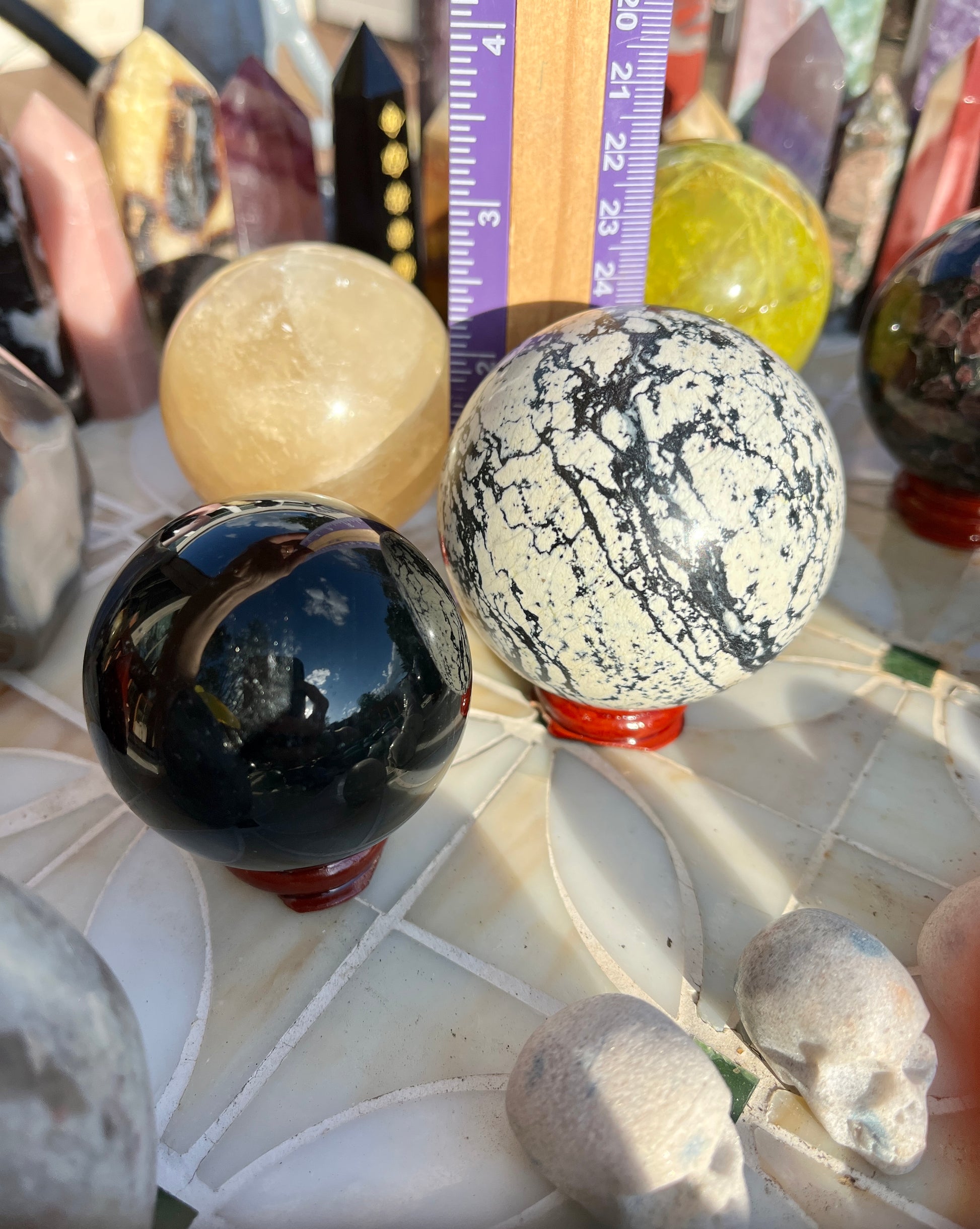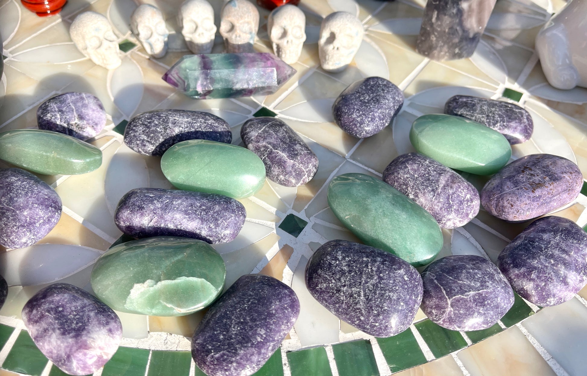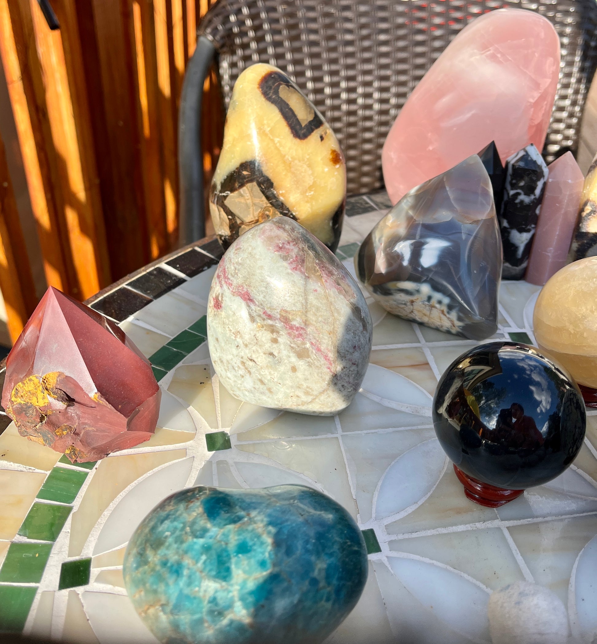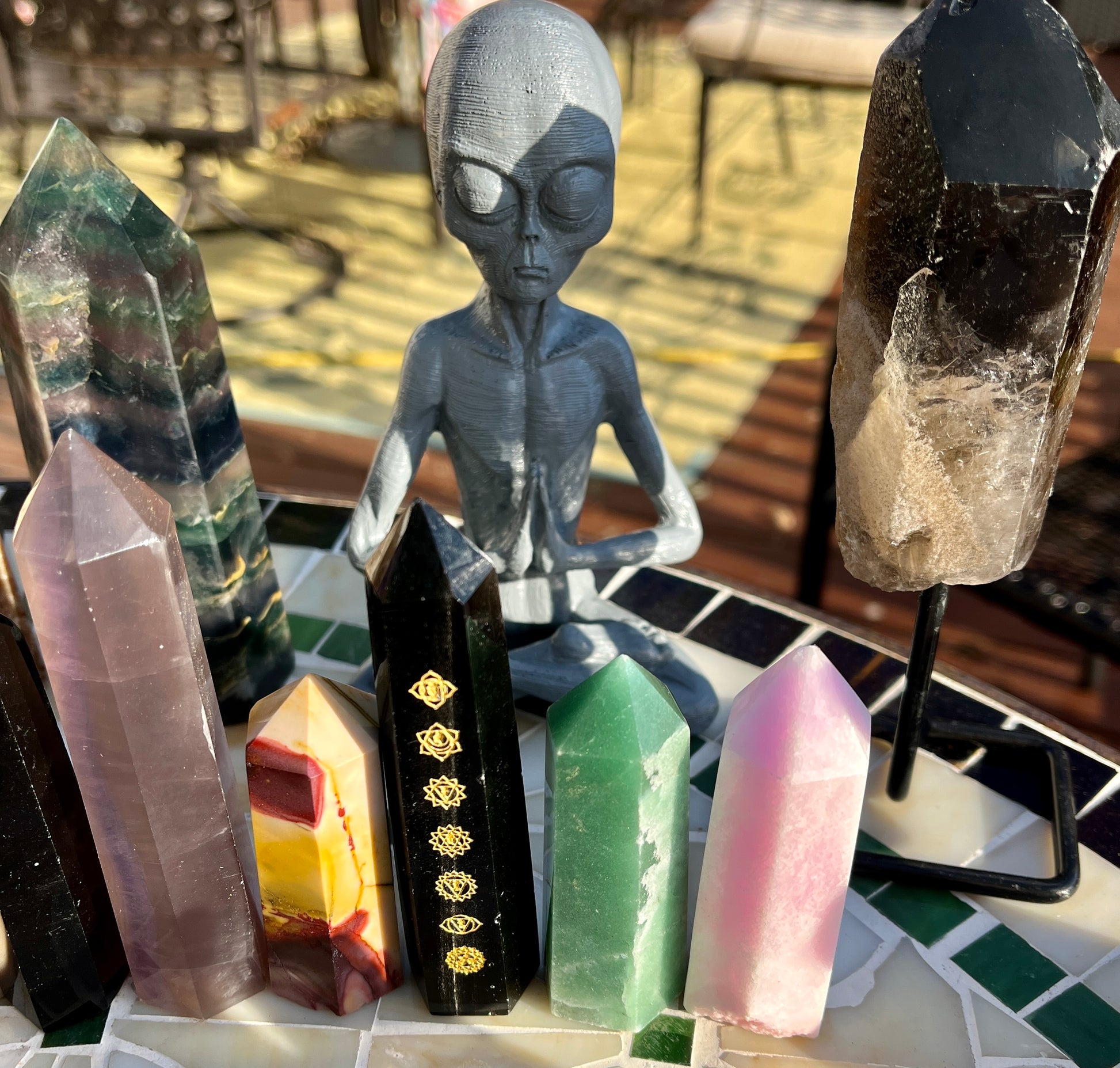 Stunning (2)Alien statue, (7)big obelisks (assorted stones) (1) rose quartz freeforms , (1) septarian freeform, (1)pink tourmaline freeform, (1)orca flame, (22)assorted crystal points, (1)mookite raw point, (4)pcs rainbow fluorite points, (2) ceramic elephants, (6) assorted spheres, (1)blue apatite heart, (6)small skulls, (14)lepidolite palmstones, (5)green aventurine, (1)double point rainbow fluorite point!!