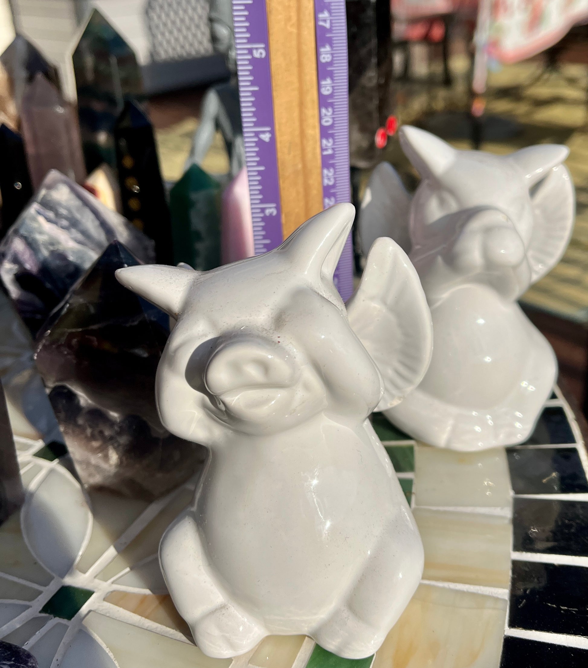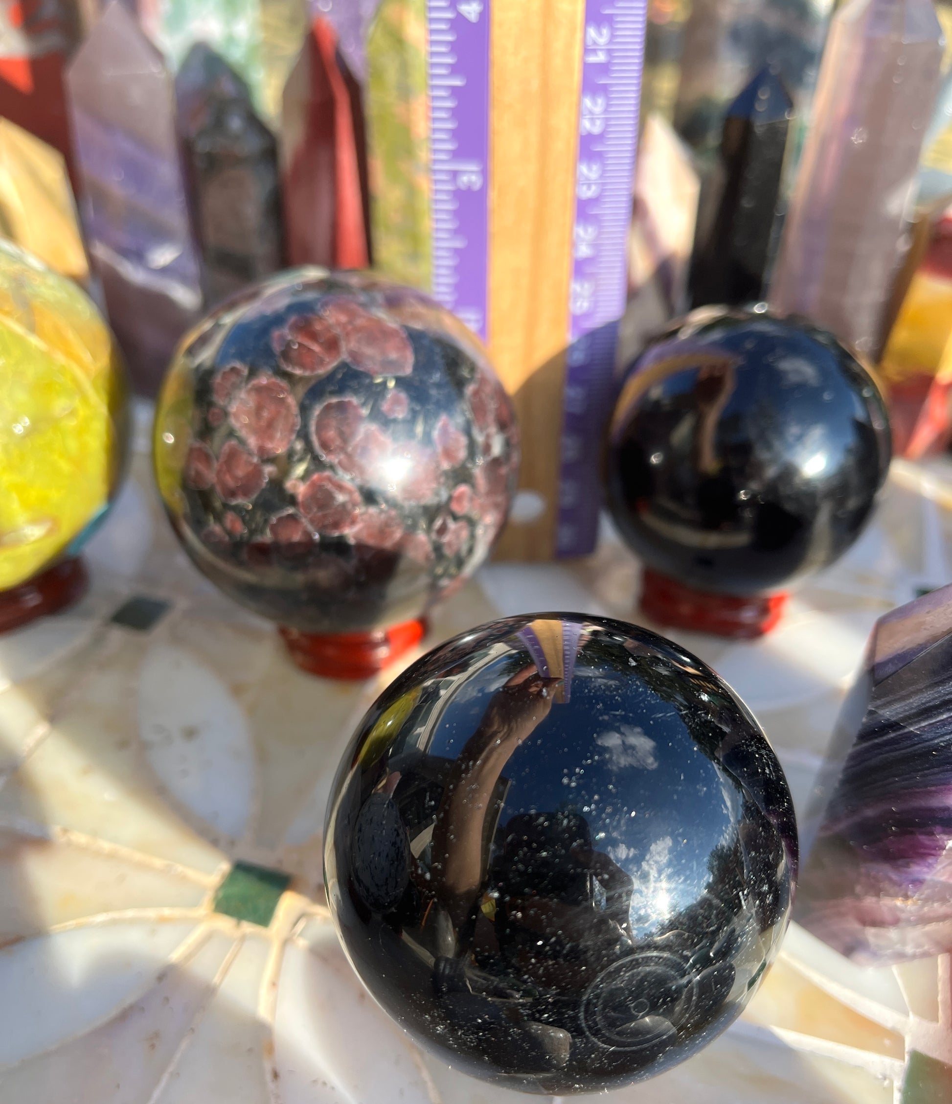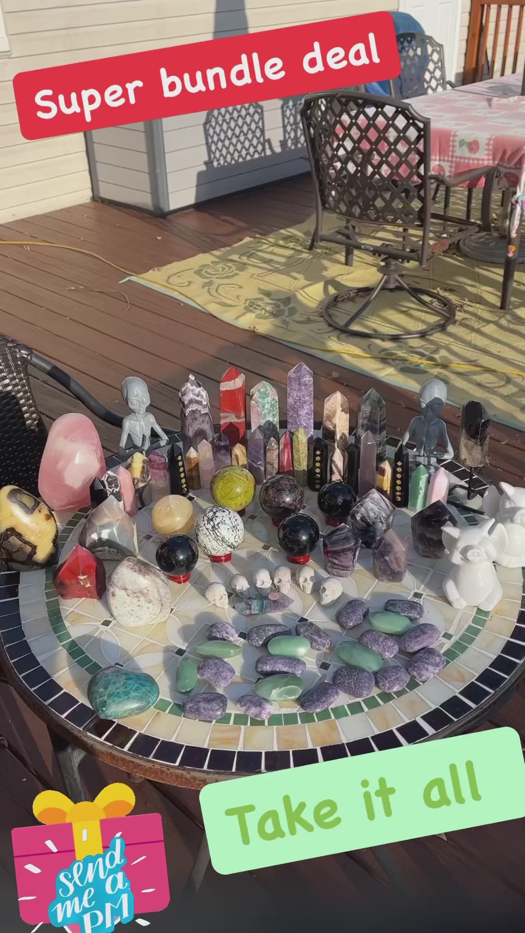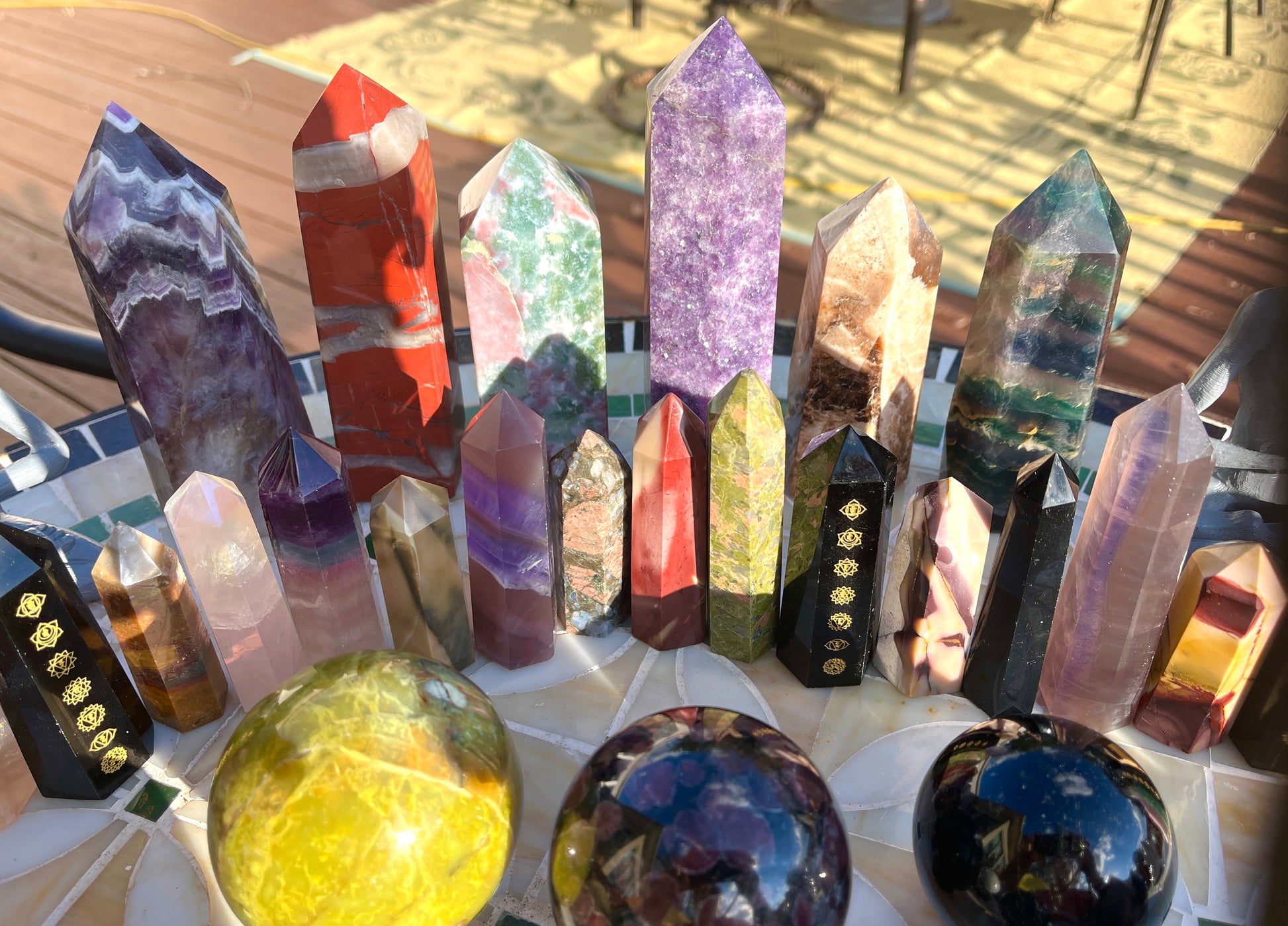 Stunning (2)Alien statue, (7)big obelisks (assorted stones) (1) rose quartz freeforms , (1) septarian freeform, (1)pink tourmaline freeform, (1)orca flame, (22)assorted crystal points, (1)mookite raw point, (4)pcs rainbow fluorite points, (2) ceramic elephants, (6) assorted spheres, (1)blue apatite heart, (6)small skulls, (14)lepidolite palmstones, (5)green aventurine, (1)double point rainbow fluorite point!!